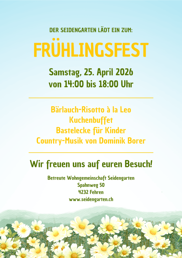 Der Frühling ist da und mit ihm die perfekte Gelegenheit, um wieder zusammenzukommen und die blühende Jahreszeit zu geniessen. Wir laden euch deshalb herzlich zu unserem Frühlingsfest 2026 ein!